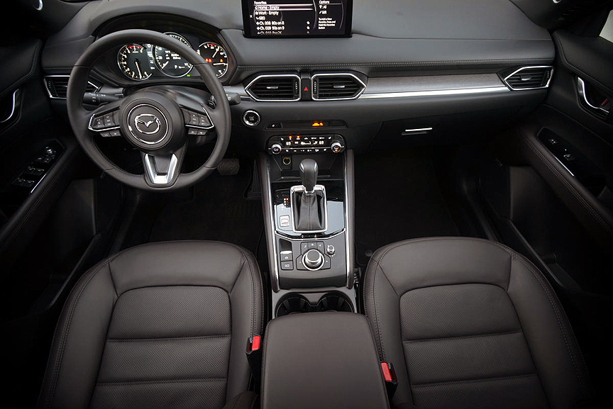 The first thing you notice when you climb into the deftly tailored cockpit of this Mazda is the exceptional attention to detail lavished on each and every button, switch, surface and trim. Unlike so many chintzy looking compact crossovers which seem to have had their seats designed by one team, their dash laid out by another, and their ergonomics done by a third group, the interior of the CX-5 cabin looks all of a piece, designed by one group of specialists all working together. Mazda calls this unity of purpose their Kodo design philosophy, and its clarity shines through in every surface you encounter here. We particularly appreciated the subtle semi-gloss grey wood inserts that graced the door panels, and the artful design of the satin chrome rings that encircled the air ventilation ducts. It should be noted that the clarity of Kodo design is enhanced by the fact that the CX-5 Signature is constructed in Hiroshima, Japan with Japanese manufactured engine and transmission.