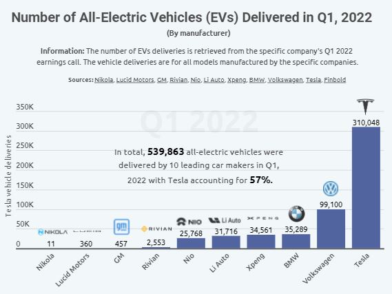 Data acquired and calculated by Finbold indicates that among leading EV manufacturers, Tesla delivered 310,048 vehicles for all models during Q1 2022. With the deliveries, Tesla accounted for 57% of the 539,863 all-electric vehicles delivered by ten leading car makers.