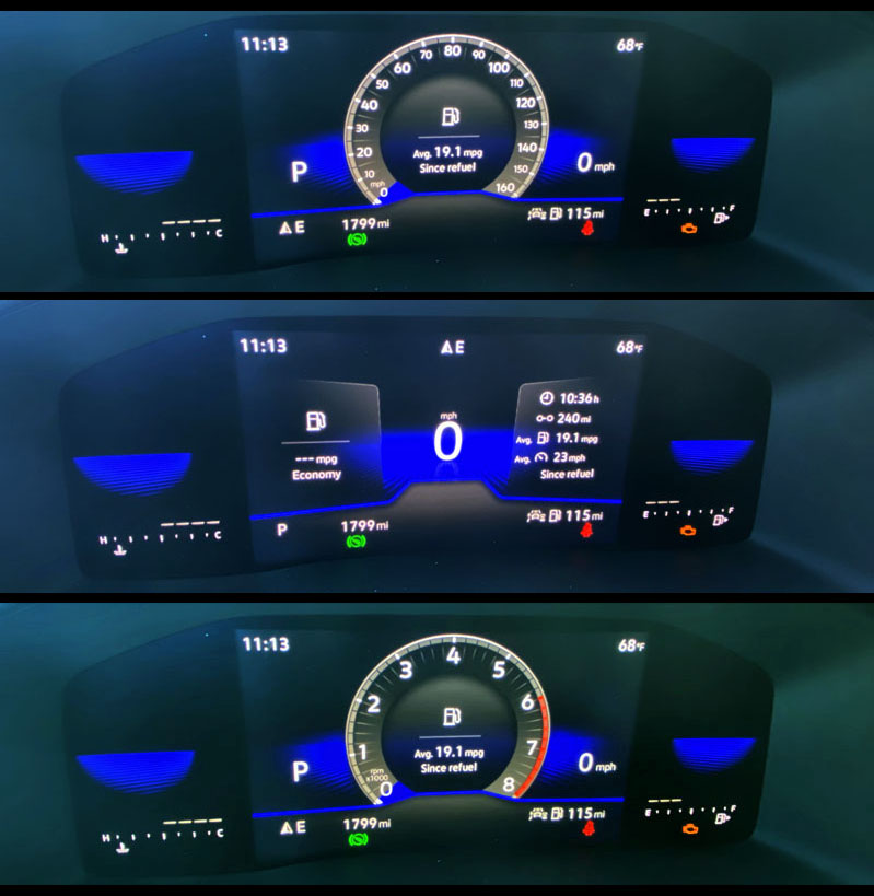 With a button press, you can switch from three hi-res digital dash displays. Very cool. And beautifully readable at a glance.
