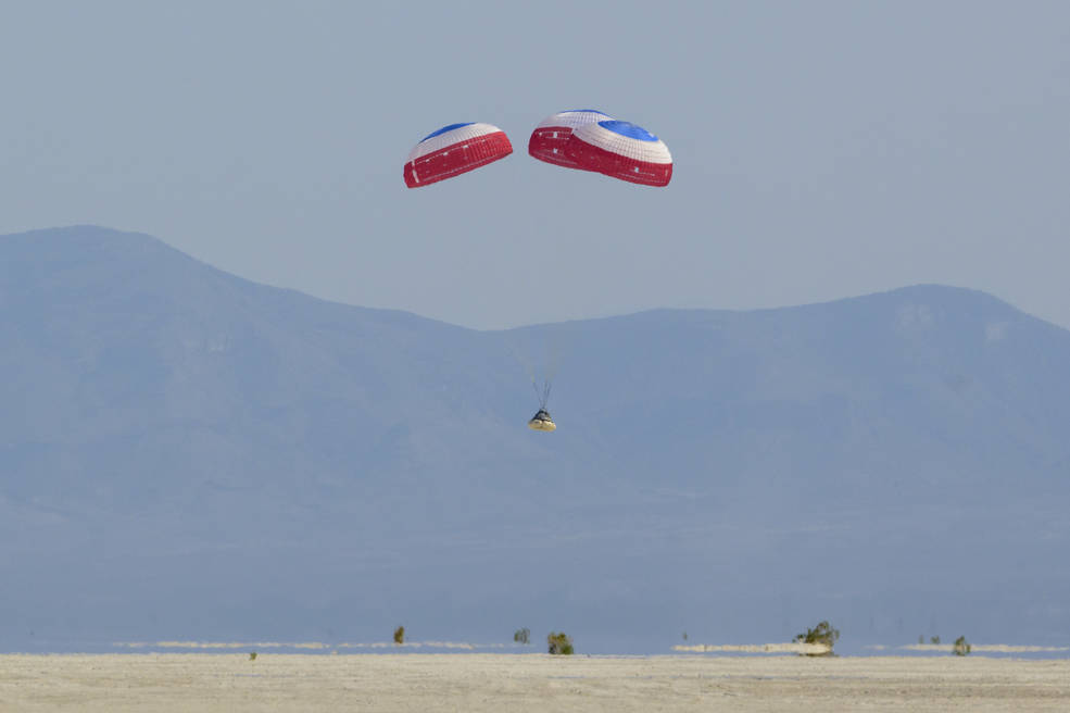 About four hours after departing the space station, Starliner touched down onto its airbags at 4:49 p.m. MDT, wrapping up the six-day flight, which tested the end-to-end capabilities of the crew-capable spacecraft. The landing followed a deorbit burn at 4:05 p.m., separation of the spacecraft's service module, and successful deployment of its three main parachutes and six airbags.