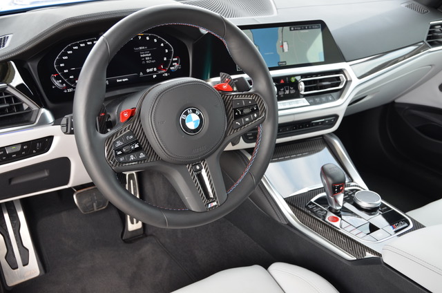 My drive time in the M4 Competition was in a loaded up Santorini Blue example with a total MSRP of $95,845 (that’s $190 per HP). The Santorini Blue is a special color and alone costs $4,500 additional. Silverstone and Black full Merino leather was another $2,500.