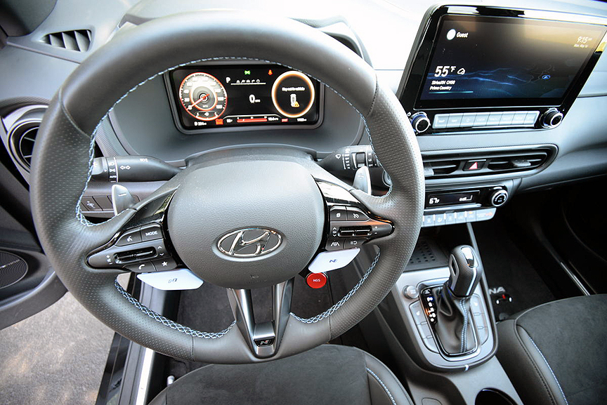 The Kona N offers 5 modes of ambulation: Eco, Normal, Sport, N and Custom. All five are instantly accessible via a drive mode knob atop the center console. Further customization is available via a pair of light blue "N" paddles located just beneath the steering wheel's center spokes. Press these paddles and the 10.25 inch digital instrument cluster's conventional look transforms into the dashboard of the Starship Enterprise. You are suddenly confronted with huge numbers detailing oil and water temperature on the left, a target styled central tachometer redlined at 6500-8000rpm, and all four tire pressure read-outs on the right.