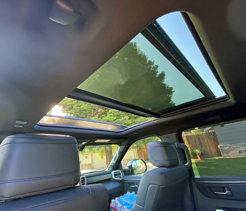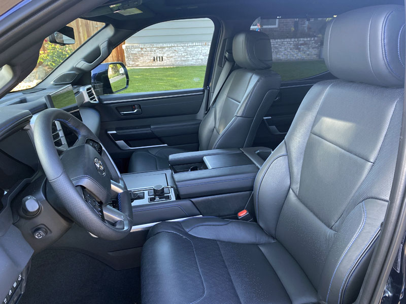 The heated and cooled front seats of synthetic leather can be adjusted 8 ways and do the trick of being comfortable for folks of all sizes. The sightlines are already strong given the height of the cab. That seating elevation gives you a safer, therefore calmer, energy to the drive. But be careful. It may look like you are going 45, but 65 looks like that when you sit high.