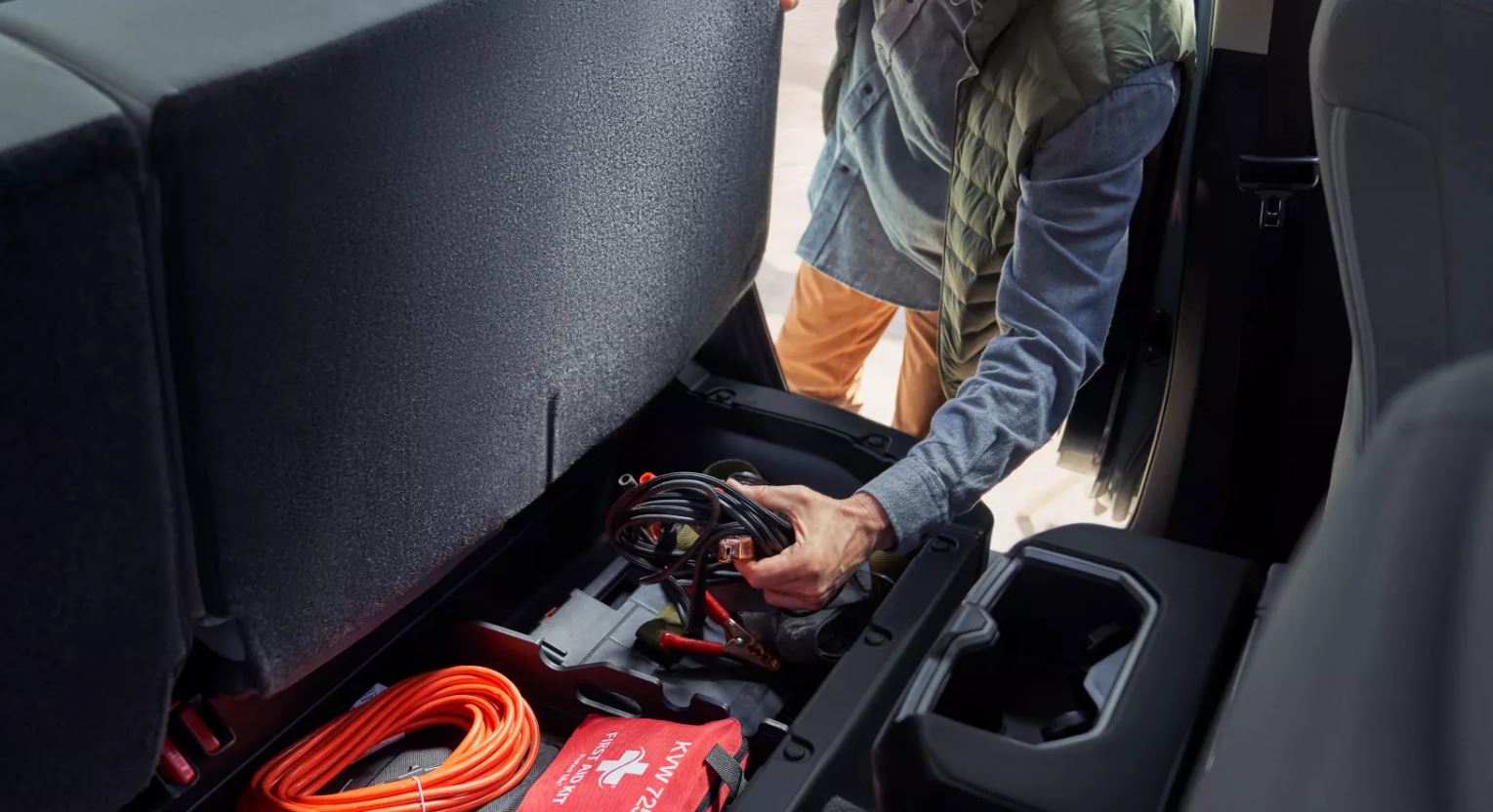 Lift the back seat up and behold a storage space for tools, flashlight, first aid kit, etc