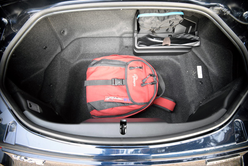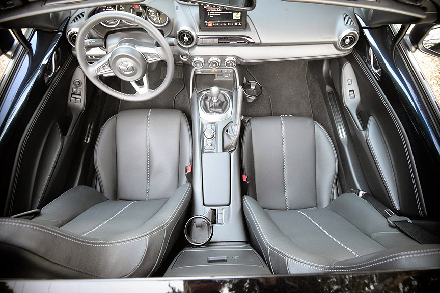 We tested a 2022 MX-5 Miata RF Grand Touring finished in "Deep Crystal Blue Mica." This sparkling beauty was equipped with a 6-speed manual gearbox, making it the most automation-free MX-5 you can buy. So rare has the manual stick shift become in today's market that Miata owners wear T-Shirts depicting a 6-speed gear pattern above the words "Gen X Anti-Theft Device." The 3-pedal operation of this transmission requires deft foot coordination, while the short but precise throws of the shift linkage demand sensitive hand-eye feedback. When you get it all right, there's no more rewarding ballet than making a Miata dance to your tune. It took me a few warm-up runs to discard my fat soled sneakers for a pair of pared down wrestling shoes. The foot box of the MX-5, like everything else about this car, is diminutive in the extreme.