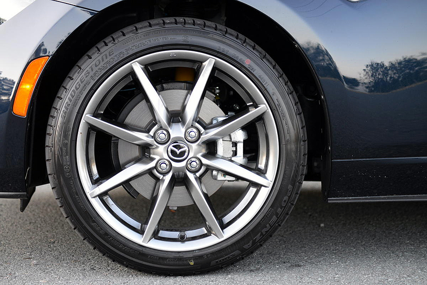 Thanks to the RF's top drawer suspension refinements and a set of 17 inch alloy rims shod with ultra sticky (TW 280) BridgestoneS001 radials (205/45R17), the RF hones in on turn apexes like a heat seeking missile. In the hands of a decent driver, this MX-5, festooned with all the suspension goodies, will own any back road hands down. So cinch yourself into the tight restraints of its accommodating sport seats, and prepare for an experience that is becoming increasingly rare in the over-protected womb of today's driving world: a scintillating experience at corner clipping you will never forget. Just the slightest twitch of the leather wrapped steering wheel is enough to alter your trajectory instantaneously. After a few canyon runs, you learn not to over-drive this sensitive assemblage of prime race bred parts. You do the thinking, and this rapier sharp Mazda will do your bidding like a silent conspirator.