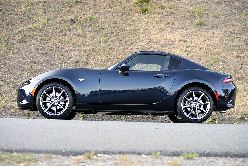 Bear in mind, however, that the RF version has a few drawbacks you should weigh in advance of purchase. One is the added weight of the roof mechanism, which increases curb weight of the 2,335 pound soft top roadster by an added 113 pounds. This in turn bumps the power-to-weight ratio of the fabric roof MX-5 from a sprightly 12.9lb/hp to the RF's less sprightly 13.5lb/hp. That will cost you a few tenths in matching the soft top's 0-60mph time of 5.6 seconds and quarter mile run of 14.4 seconds. But for the lockable security of the hardtop, plus its quieter interior at freeway speed, the RF may well be worth giving away a few tenths in ultimate performance here and there.