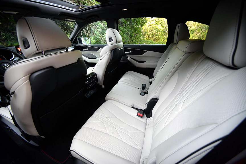 Before we get into the operation of TTI, let's recount the substantial ways Acura has improved generation four of this lusty SUV. A revamped and stiffened platform increases width and length by 2 inches, and stretches the wheelbase by 2.8 inches. That reconfiguration confers spacious luxury status on second-row passengers and makes the tilt-down third-row bench a more useful and attractive feature. It also increases cargo volume to 16.3 cubic feet. New for 2022 is a removable second-row center seat that allows you to convert the cabin to four captain's chairs. But the increase in platform size jumps curb weight by nearly 300 pounds to 4,514 pounds.