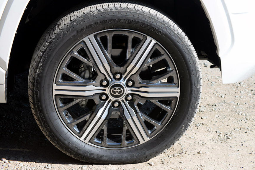 In spite of its airy cabin height, ride quality of the new Tundra is far from ethereal. The Capstone rides on 22-inch dark chrome alloy rims fitted with 265/50R22 Bridgestone Dueler RT radials. Thanks in part to the low sidewall height of these Bridgestone tires, the new Tundra rides like a bucking bronco over even the slightest pavement imperfections. The fact that Toyota now uses a multi-link rear/coil-spring rear suspension for the Tundra in place of the former leaf spring set-up has not quelled the pitching and bucking. Although you can choose from 6 different ride settings (Eco, Comfort, Normal, Sport, Sport+, Custom), none of them come close to matching the magic carpet pillow promise of the interior design. In fact, with its jacked cabin and mini sidewall tires, the Tundra Capstone projects a Low Rider look. To that end, you can even order yours with an optional ($1,045) air suspension system that controls load-leveling rear height and provides adaptable variable suspension as well. If this were my truck, I would dump the 50 series tires in favor of something with a taller aspect ratio.