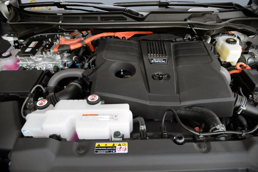 Despite the lavish Lexus contours and treatments, there’s a whole lot of real truck hunkered down beneath the fancy façade. The business end here starts with a new V6 engine dubbed i-FORCE MAX which displaces 3.5 liters and utilizes twin turbos and water intercooling to generate 437hp and 583lb.-ft. of torque. This output is augmented by a hybrid package utilizing a 48hp electric motor charging a 288 Volt nickel metal hydride sealed battery to provide instant torque - even before the twin turbos spool up. The hybrid drive line connects to all four wheels through a 2-speed (low/high) transfer case and a 10-speed electronically controlled automatic transmission. The gearbox provides Tow/Haul mode, uphill/downhill shift logic and sequential shift mode via steering wheel paddles. Maximum towing capacity is 10,340 pounds.