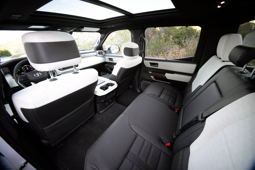 In fact, so plush is the interior of the Tundra model-range topping Capstone that you will forget all about the payload and towing capacity of this behemoth. The Barcalounger-sized all leather seats are exquisitely finished in white with black trim. Both front and rear seats feature heating and ventilation. The front row settees offer 10-way power adjustments plus 4-way lumbar support. Perforated leather is lavished on the steering wheel rim and shift knob. Soft-touch surfaces grace the instrument panel, center console and door panels. The instrument panel consists of a 12.3-inch digital screen with selectable gauge displays featuring fuel economy, driver assistance's, and trip information.