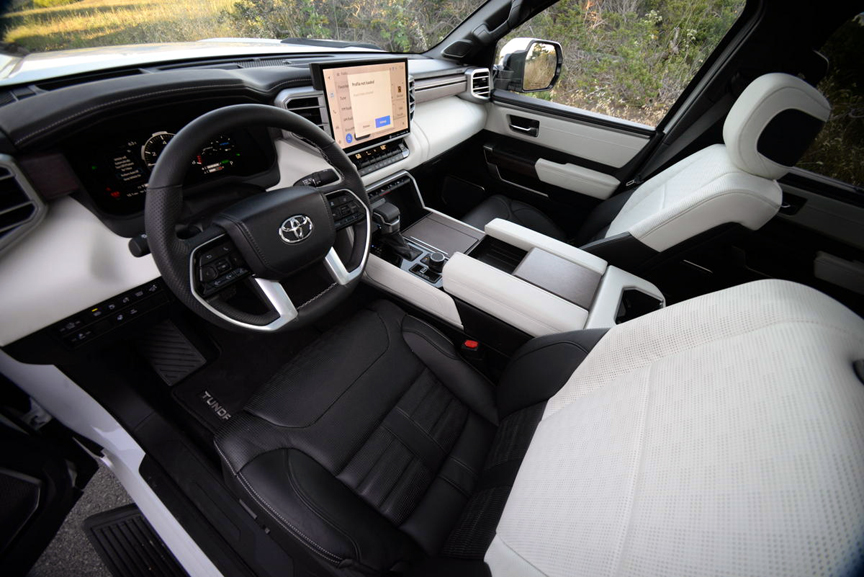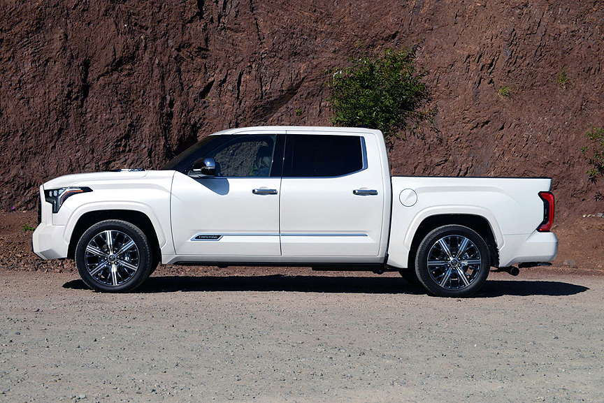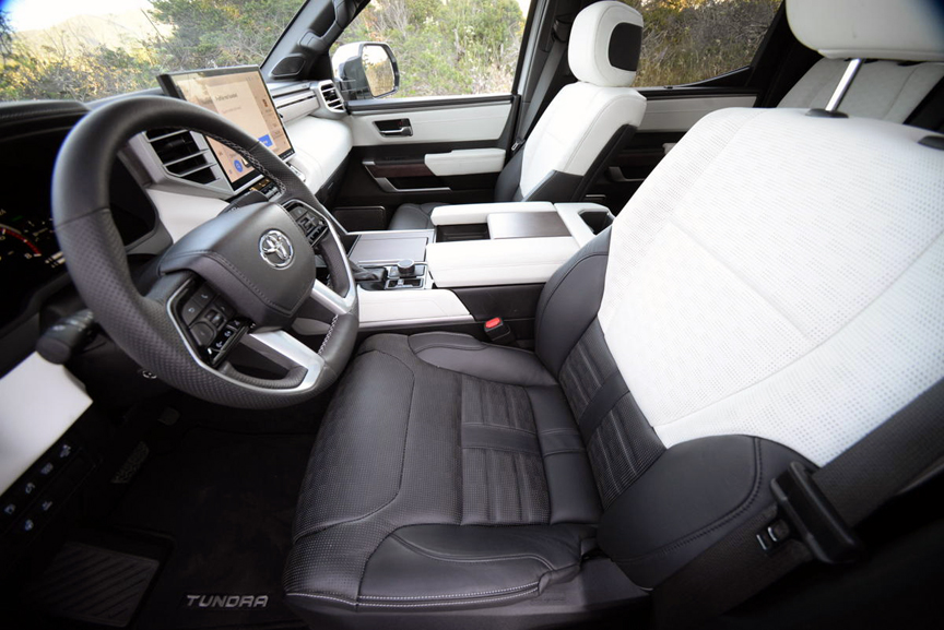 When is a truck not a truck? When it’s Toyota’s 2022 Tundra Capstone. This is an amazing vehicle. It looks like a truck from the outside, albeit a real fancy one with subtle body contours and a stunning “Wind Chill Pearl” paint job. But once the power retractable running boards lift you into the cabin, any work truck scenario evaporates. Toyota designers have managed to transform your preconceived notion of a pickup interior into a Lexus reverie.