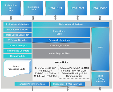 - 128-bit (ConnX 110) and 256-bit (ConnX 120) SIMD performance for complex math operations based on 8-, 16- and 32-bit fixed-point and half-, standard- and double-precision floating-point