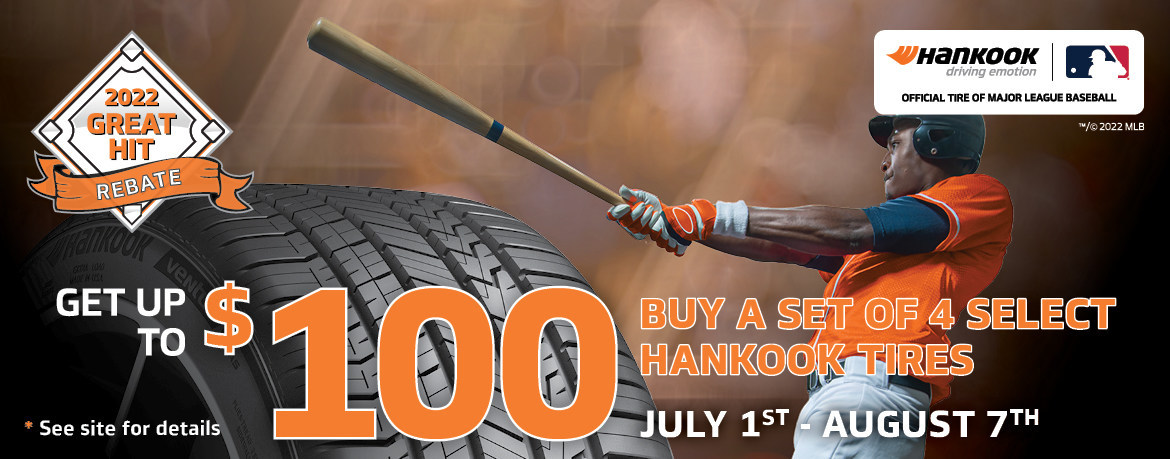 NASHVILLE, Tenn., July 1, 2022 -- Leading global tire maker Hankook Tire announces its latest consumer promotion, the Great Hit Rebate. With the baseball season heating up this summer, Hankook will offer consumers up to $100 in savings on popular passenger, SUV and light truck tires. All rebates should be submitted online at hankookrebates.com, beginning today.