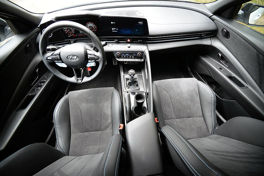 Hyundai also provides a pair of the best sports seats available today. Fully ensconced, you will find them wonderfully supportive as the Elantra nips apexes with precise alacrity. The interior is intelligently laid out, with a pair of 10.25 inch screens. One lies directly behind the steering wheel, and can be configured to provide exactly the information you seek. The other lies atop the dash, and displays navigational maps, music info, plus N-specific set-up information. The only drawback to the interior is the paucity of rear vision. Small, upturned rear quarter windows and a minimal backlight combine to make reverse maneuvers difficult. You will need to rely on the screen image projected from the backup camera, because otherwise you can't see what behind you.