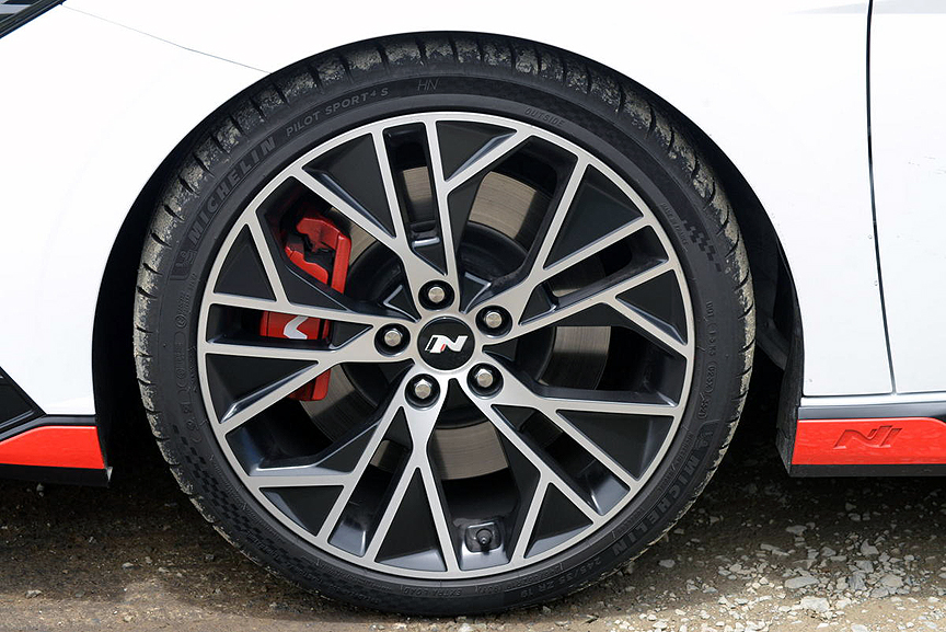 In order to insure that the Elantra N wins its share of IMSA races, Hyundai has homologated a laundry list of potent refinements that distinguish the N model from lesser variants. To that end, they beefed up the basic chassis with an impressively long list of go-fast goodies. Topping the list is a set of 19 x 8 inch alloy rims shod with 245/35R19 Michelin Pilot Sport 4S (summer-only) rubber. These Michelins are designed specifically for this application. In fact, the car's window sticker lists them as the only tires OEM tires supplied for the Elantra N. They carry a soft Treadwear rating of TW 300 and a Traction rating of AA, They stick like glue no matter how much you provoke them into breaking traction.