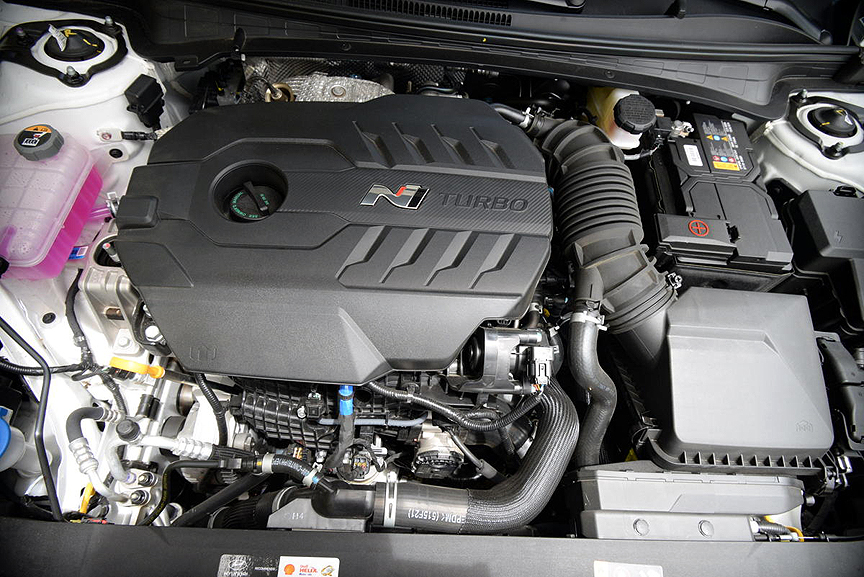 Heft the surprisingly heavy hood and you will discover a four cylinder, twin scroll turbocharged gas engine that has been torching the opposition in IMSA's Michelin Pilot Sport touring car (TC) division. This fuel injected 2 liter mill is perfectly symmetrical, with 86mm bore and stroke dimensions. While similar to the 276hp engine Hyundai fits to their Veloster N, the Elantra version adds an over-boost feature which provides an extra 10hp when you depress the red "N" button attached to the right spoke of the steering wheel. Think of it as the "Push-To-Pass" feature fitted to the current crop of Indycars. But unlike the limited number of boost time offered in Indycar, the Elantra N produces an endless succession of what Hyundai calls "N Grin Shifts."