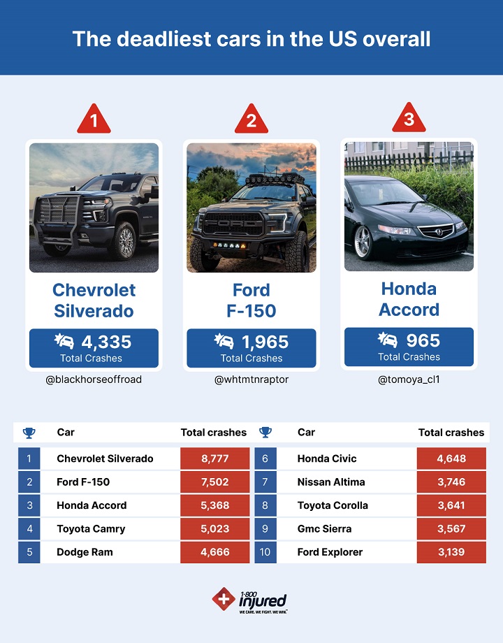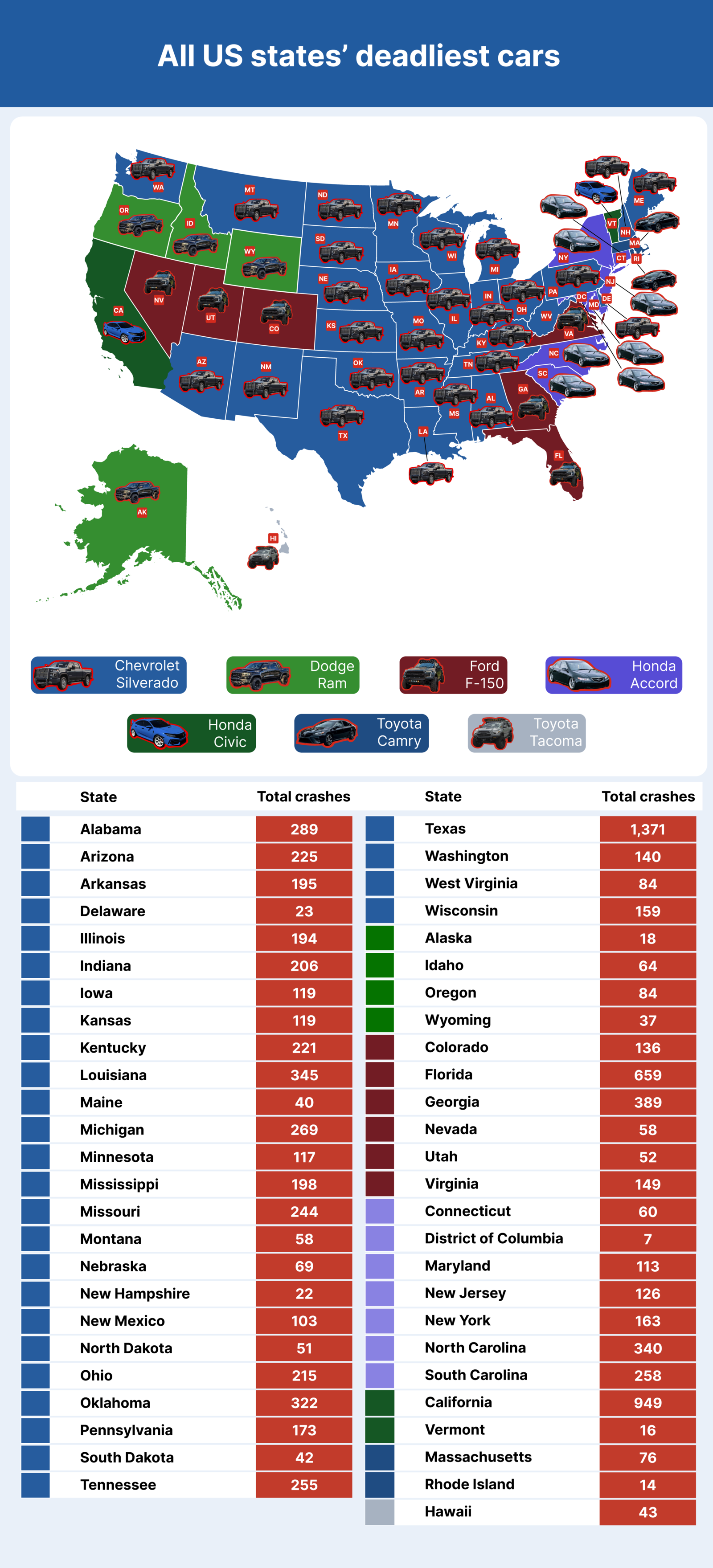 These cars accounted for the most crashes in the U.S. overall between 2016 to 2022. Most of these makes and models were the most deadly for many of our states.