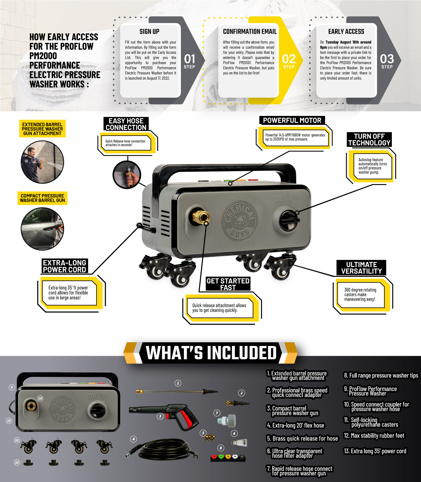 "It's one thing to design a tool that can do one job well, it's even more exciting to design a tool that inspires people to constantly find new uses and never want to stop using it," says Paul Schneider , Chemical Guys Creative Director. "Cleaning your house and car doesn't have to be boring or tedious; it can be fun and satisfying. When we developed the ProFlow PM2000 Performance Electric Pressure Washer, we took everything we loved about pressure washing and all the things that made pressure washing challenging to create not only a tool but a powerful solution. We spent years innovating to create a tool unlike any other, and we are proud to say it is our first."