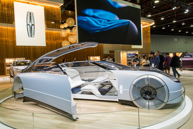 But immediately to the right was the bright and artful Lincoln display offering some more expected panache with two wild and beautiful concept vehicles: the Star Concept, previewing the next evolutionary steps in Lincoln design language; and a way-out look into the future of an autonomous, high-style conveyance, the L100, a “sanctuary” they describe it.