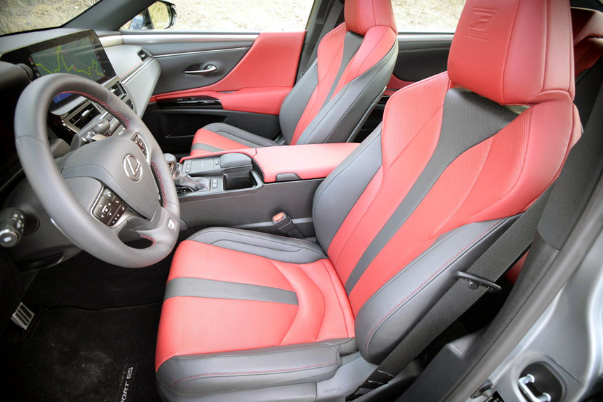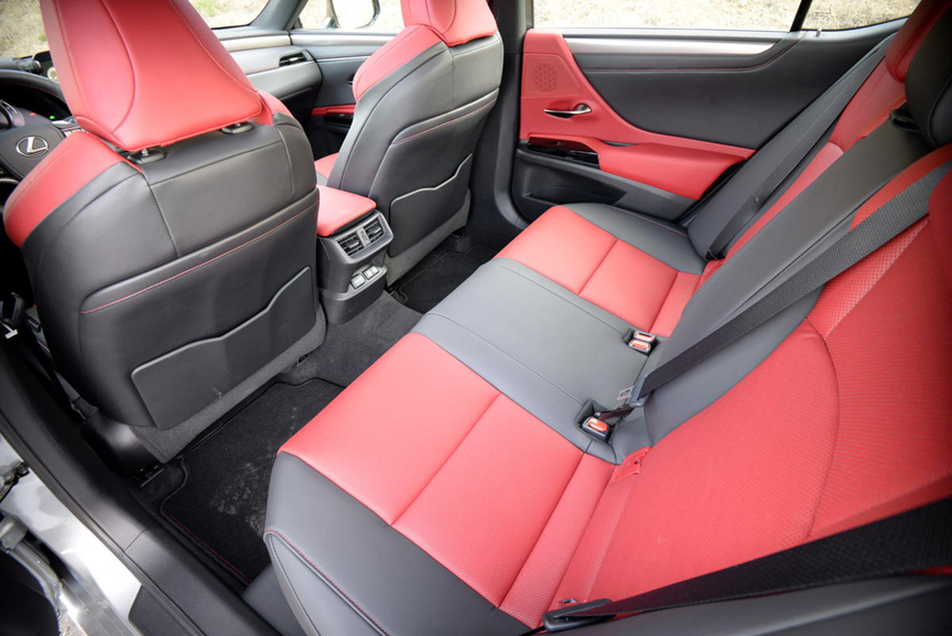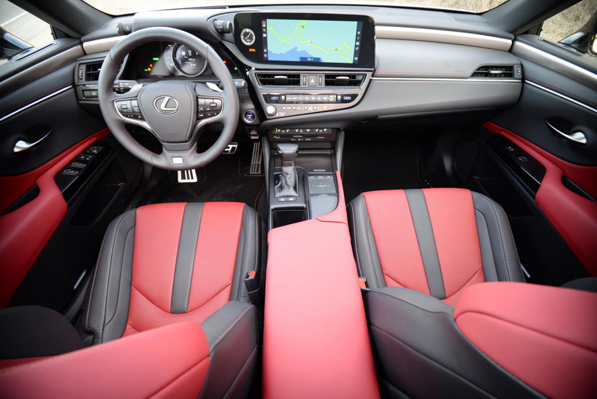 Swing open the sparkling Iridium (Premium Paint: $500) door to the cockpit of the ES, and you are confronted with a visual Wow Factor that peaks the eye pop meter at 10. The pair of "10-Way F Sport Bolstered Front Heated and Ventilated Power Seats" are meticulously upholstered in alternating swaths of red and black leather. The high sided bolsters are charcoal, with red center sections. An hourglass shaped black racing stripe runs through the center line of each seat. The top of the black center console is done in contrasting red, as are the aft portions of all four door panels. A pair of commodious rear seats continue the color combo with red center cushions nested against black bolsters. For a passenger car that doesn't lay claim to sports sedan bragging rights, the strident interior of this Lexus will rev you up quicker than anything from BMW or Audi.