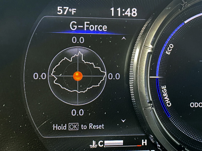 Looking like a targeting display from Star Wars, I was amused by the G Force display, but not enough to test it. If I lived closer to Auto Channel's racing pro David Coleman I would let him take the wheel to test it.