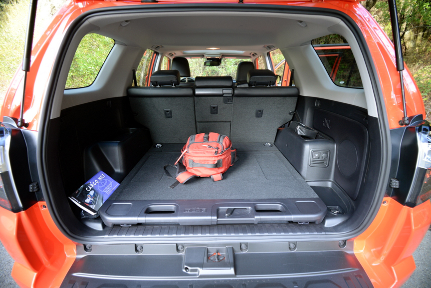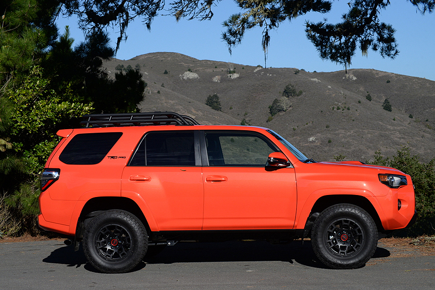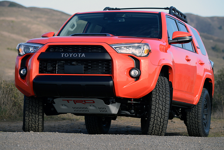 The same goes for the jilting truck-style rodeo ride of the bullet-proof ladder frame, the thumping roar of the V6 when you squirt the gas, and the excellent frontal, side, and rear visibility from the driver's seat. Most of all, however, the 4Runner TRD Pro we tested, will take you off-road anywhere with utter confidence. Try that trick in your pretty little car-based "SUV" and you'll wish you hadn't. We could start out by extolling the long list of dedicated off road chops that distinguish the TRD Pro model from lesser 4Runners. But first, let's get to the sensational "Solar Octane" metallic orange paint that coats this beauty. In bright sunlight, the new Toyota dazzles the retina. In shade it glows like an incandescent ember. For a "Special Color" fee of just $425 you will own the most wicked looking SUV in the universe. So the Great Pumpkin does exist. and Linus was right after all.