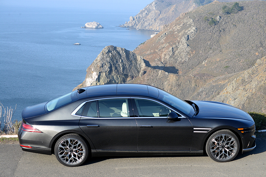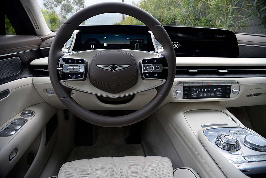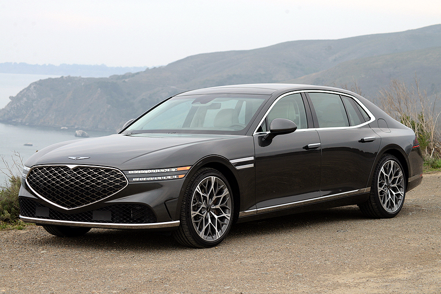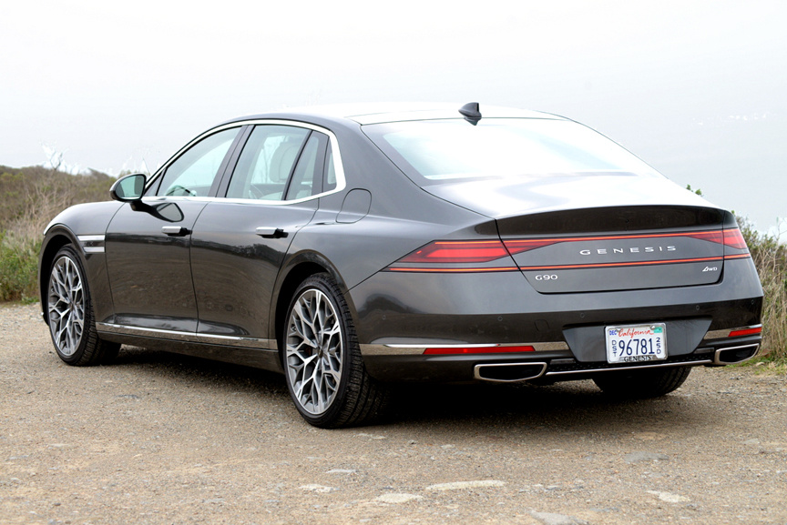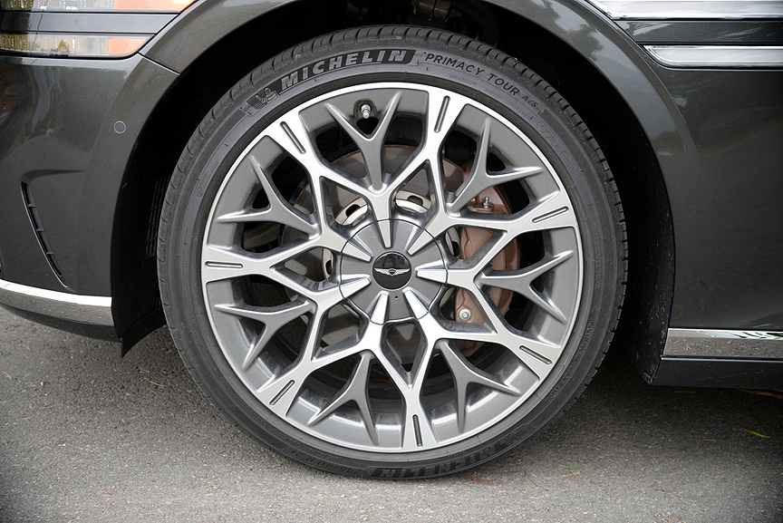 In addition to all the visual, sensual, and audio fireworks inside, the G90 is an impressive looking beast from the outside. The frontal aspect is daunting, with a cavernous grill making a predatory visual statement that is reinforced by a squadron of 48 tiny projector headlights arrayed in clusters of 24 above each side of the grill. A pair of separately triggered front and rear panoramic roofs brighten the already festive interior, and each oversize wheel well is set off with a 21-inch alloy rim bearing staggered Michelin Primacy Tour A/S radials (245/40R21 F: 275/35R21 R).