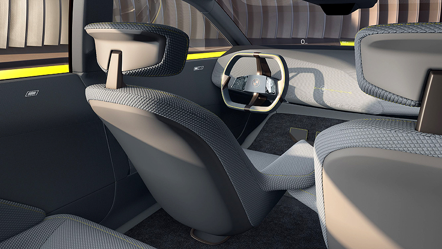 Inside, digitalisation goes hand in hand with reductive use of materials, operating controls and displays to ensure nothing distracts from the digital experience and the new feeling of enhanced driving pleasure. The unconventional design of the steering wheel, with its central vertical spoke, creates touchpoints that come to life when approached or touched and can be operated by moving the thumb. These phygital touchpoints control selection of the content projected onto the windscreen and, together with the Head-Up Display, thus support the principle of “hands on the wheel, eyes on the road”.