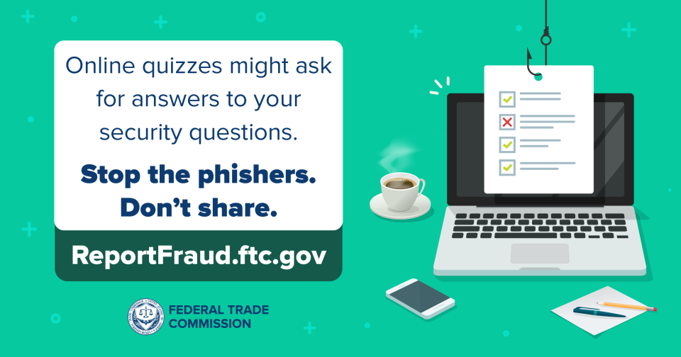 If you suspect that an online quiz is a phishing scam, tell a friend. Then, report it to the FTC at ReportFraud.ftc.gov.