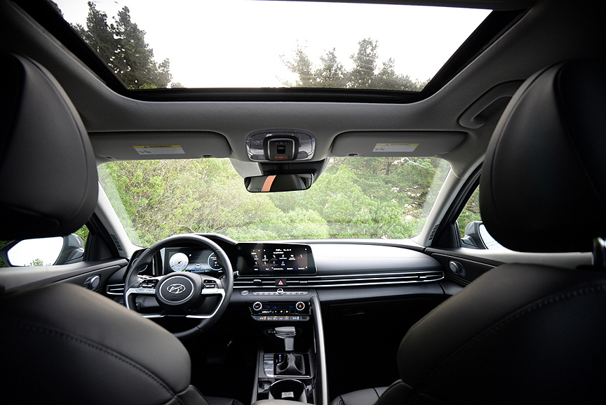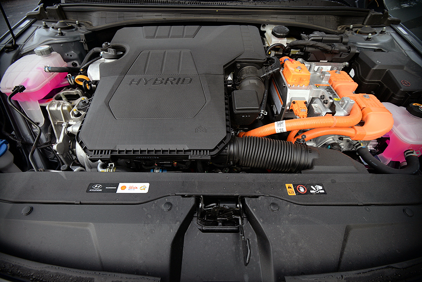 For a compact sedan with a base price of just $30,265, the Hybrid Limited is surprisingly well-equipped and comfortable. The front seats are craftily tailored to look like they belong in a much more expensive vehicle. A striking blue illumination light runs across the entire length of the dashboard and provides a kind of disco vibe to the otherwise solemn black interior. A pair of 10.25-inch illuminated screens keep you advised of the most pertinent functions, with the screen in front of the driver dedicated to instrumentation, and the high-resolution touchscreen sprouting from the dash in charge of infotainment and navigation. Both the driver and front seat passenger are treated to 3-stage heated seats, though a heated steering wheel is notably absent. Instrument presentation varies according to the Drive Mode you have selected. Subdued blue means you're in Normal Mode, while flamboyant red indicates you've selected Sport Mode. When that red mist descends, the steering feedback tightens substantially, and the 6-speed dual-clutch automatic transmission drops into a lower gear to give you the impression that you're covering more ground faster than before. Although you can drop the gearbox into full manual mode by displacing the stick shift lever to the left, it would have been more useful had Hyundai provided steering wheel paddles like the ones in the Tucson Hybrid.