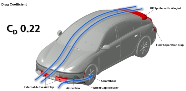 IONIQ 6's ultra-low drag coefficient of 0.22iii is assisted by a low nose, active air flaps, wheel gap reducers, elliptical wing-inspired spoiler with winglet, slight boattail structure, separation traps on both sides of the rear bumper, full underbody cover, deflectors and reduced wheel-arch gaps.