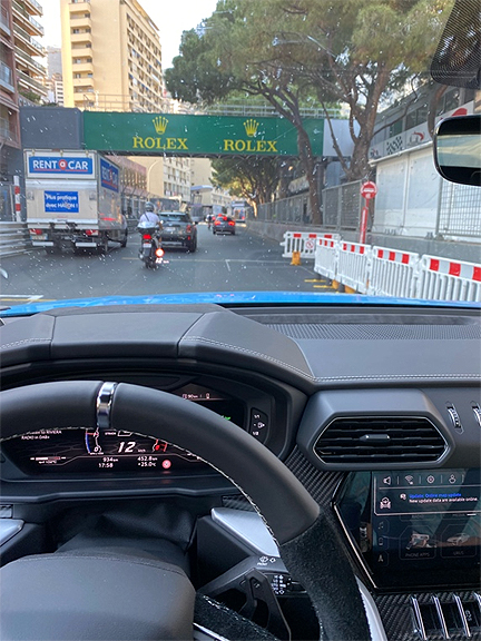 Back at the famous start/finish line, which is a public road (Blvd Albert 1er), with three bus stops and a 24 hour Casino supermarket opposite, we position the Urus at Charles Leclerc’s pole position grid and attempt a brief launch control into the sharp right hander at St. Devote, named for the Christian Saint of Monaco, who is celebrated every February by residents and the Princely family with a burning boat ceremony, the same spot where the F1 drivers do donuts to return themselves to the track after out braking themselves into the second gear 60mph turn. With large spaghetti plate-sized carbon ceramic discs all-round, there’s zero chance of not making our apex and we power up the hill with the twin turbo’s spooling up, reminiscent of the old 80’s F1 turbo days.
