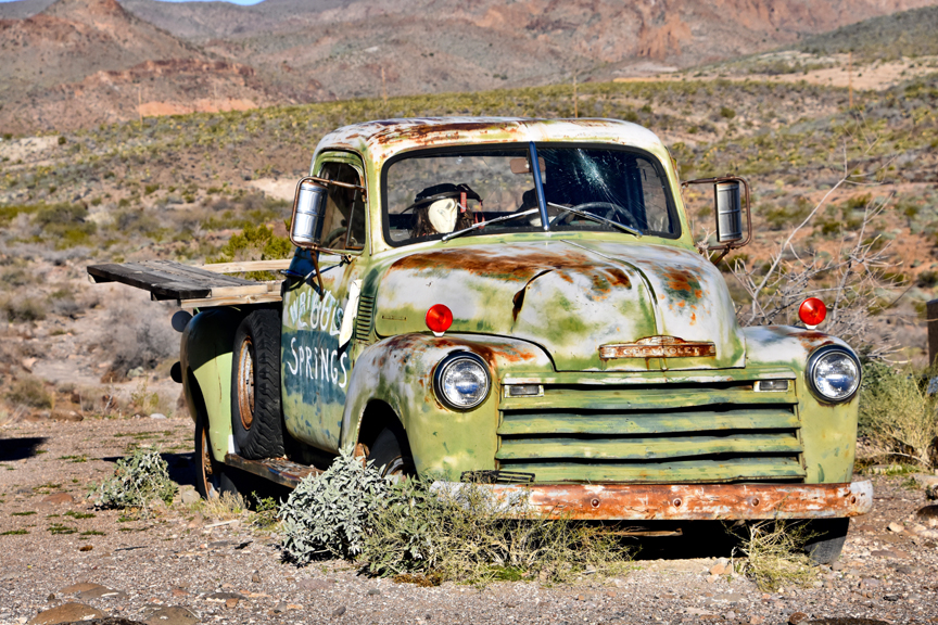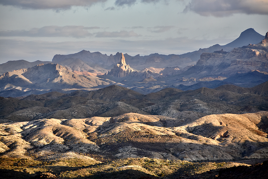 Just past Oatman the rocky, dirt Silver Creek Road presented itself on our left. The sign says, “ROUGH ROAD NEXT 10 MILES.” In the best shunpiker tradition we head down there to see where it goes. Just a few miles in we find ourselves traversing the edge of a large, scenic valley, the Mount Nutt Wilderness Area, just as the sun broke along the ridges to our east, lighting up the scene like a painting in the Louvre. About six more miles in we found a large gold and silver mine where we met the first vehicle we’d encountered the since leaving I-40, a huge mining truck.