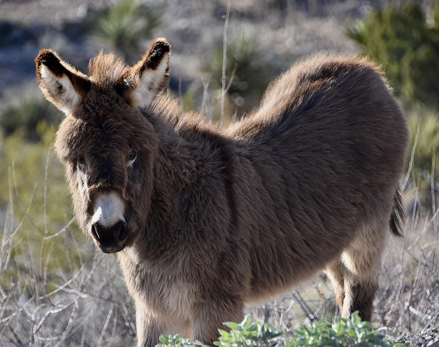 Back to the main road we continue east toward Kingman. Halfway down the mountain just past Sitgreaves Pass, elevation 3,550 feet, looking out over the desert floor, we found another family of burros flirting with a couple old folks in a ragged old Ford Escort on the side of the road. Joining the fray, I offered up the leftovers from my breakfast sandwich, but they had no interest in that. (Probably because they are herbivores, I realized.) A little, long-haired brown one kept out of reach, but the other half dozen just seemed to want some human interaction. The old folks moved on, but I hung out, petted and talked with them while. What gentle beasts they are - descendants of burros turned lose to fend for themselves when the miners left. They’ve done rather well, it seems.
