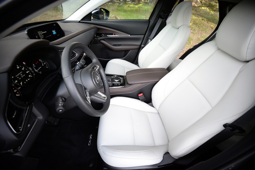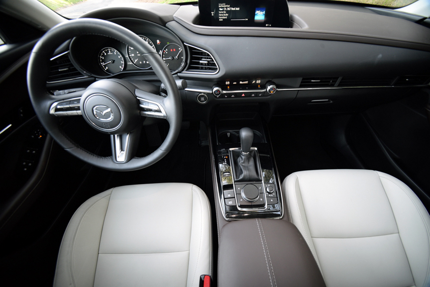 The interior is done with tastefully understated chocolate trim harmonizing with black leather seating surfaces. This combination goes a long way to helping the CX-30 Turbo Premium emulate more expensive compact SUV offerings from BMW and Audi. Only a couple of minor irritants detract from the overall upmarket vibe. One is a very un-Mazda-like razor sharp edge that your fingers will discover when resting on the door-mounted passenger armrests. A different sort of disappointment awaits when you attempt to program the baffling infotainment system, which requires endless fiddling to fulfill the simplest requests.