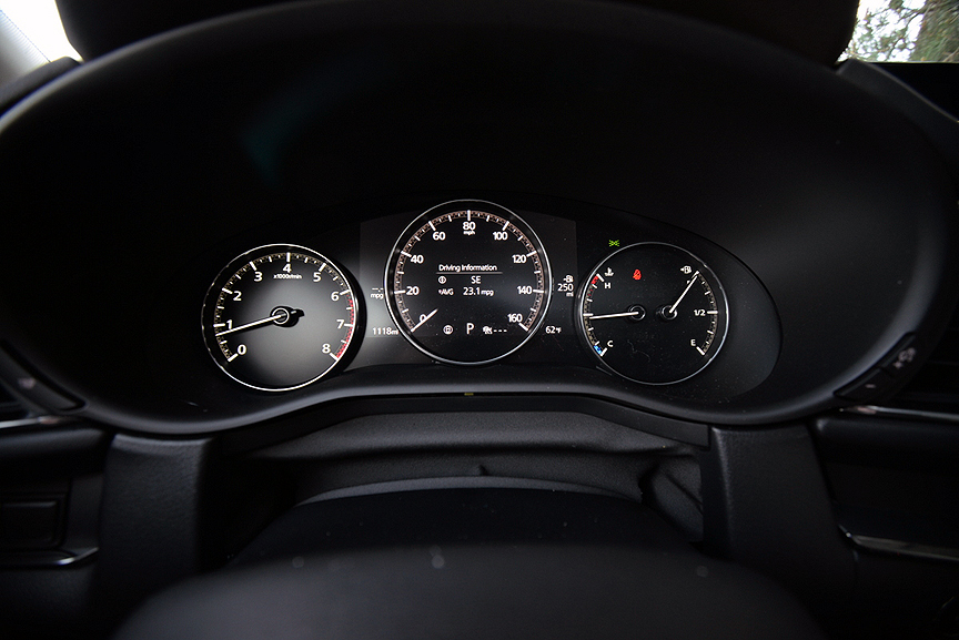 Stuck in an hour-long Interstate 80 traffic jam, we had ample opportunity to assess the chops of Mazda's "Traffic Jam Assist" as it played out on "Mazda Radar Cruise Control." The system worked reputably well at keeping pace with the herky-jerky stop and flow of rush hour, always maintaining a buffer we pre-set at 2 car lengths. We especially appreciated the clarity of the cruise control information displayed by the "active driving display" on the instrument panel. Once we got free of the I-80 snarl, this smallest of all Mazda SUVs gleefully sprinted for the finish line of our trip, unencumbered by the nuisance of stop and go stutters. On the open road, this little SUV really loves to fly.
