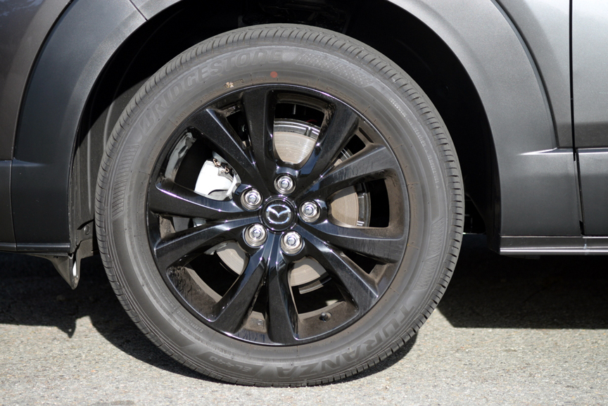 Practicality aside, the beauty of the CX-30 lies in its driving chops. It retains the precise handling of the Mazda3, while echoing the responsive purity of Mazda's MX-5 Miata. From the driver's seat of the CX, it's difficult to discern that you're piloting a comparatively tall (62 in high) SUV. Mazda's secret handling sauce lets you tackle twisting backroads with aplomb. This company specializes in getting the suspension/ ride height/ rubber patch equation just right. To that end, the CX-30 mounts grippy tires (215/55R18 Bridgestone Turanza EL440) on fat black alloy rims. That combination supplies confident turn-in and great mid-corner stick. Standard "G-Vectoring Control Plus" allies with standard "I-Active AWD" (all-wheel-drive) to allocate power as needed to each Bridgestone radial.