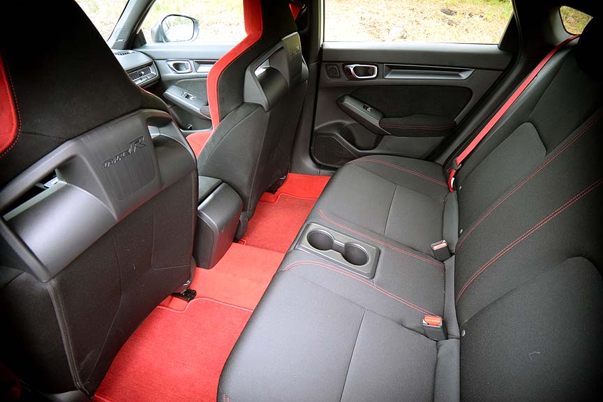 The Type R's cockpit was clearly designed by racers for racers. The bright red "suede effect” front sport seats provide exceptional full body support without needing to rely on myriad motors. But you'll have to put up with a bit of inconvenience when you climb aboard since you don't so much sit in these seats as wear them. In fact, they provide so much support under your thighs that your leg comes close to hitting the steering wheel. So you learn to slither into the Type R rather just dumping your buns. Once you're cinched up and set to go, the only thing missing is a helmet and a Nomex driving suit.