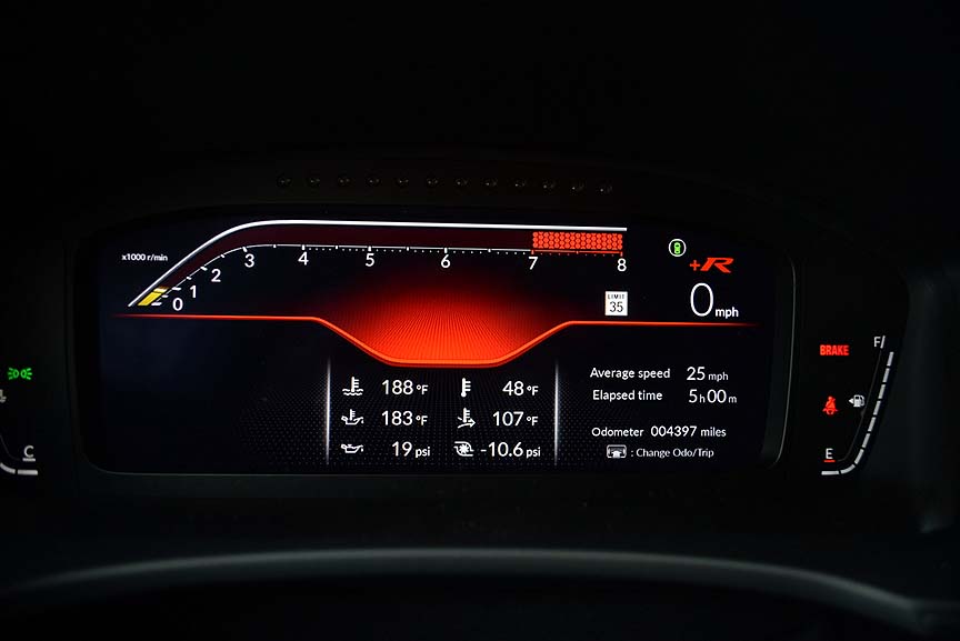 To capitalize on those structural improvements, Honda retuned the adaptive suspension dampers to provide 4 different drive modes. A more comfortable ride quality is available in Normal mode, with increasing levels of adhesion on tap as you ascend the mode ladder from Sport to Sport+ to Type+R. You can also dial up your own Individual mixture which provides a combination of damper setting, exhaust note (triple tail pipe), and throttle response to suit yourself. The Individual array we liked best utilized ultra stiff dampers, muted exhaust, and the available Formula 1 style bar graph readout for the tachometer.