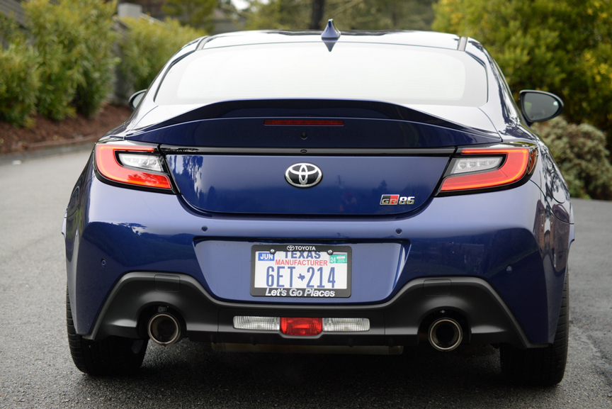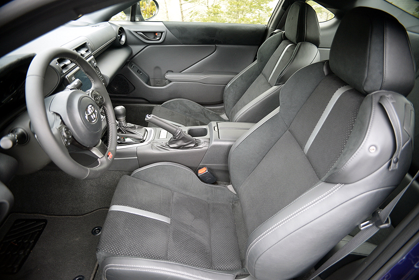 Racing plays an important role in the design and development of the GR86. This is a svelte coupe with 4 seats but room for only 2 adults. The jump seats in back look inviting until you realize that: A) you can't climb in, and B) there's no room for your feet anyway. In other words, the +2 part of the description applies to infants and toddlers only. Because of its low roof height (just 52 inches) even entry to the grippy ultrasuede front seats requires an Olympic-quality butt drop followed by a double leg swivel. With a little practice, you can usually stick the landing. Once ensconced in Toyota's speed module, you will discover that the seats offer the same marvelous grip as the super sticky tires (Michelin Pilot Sport 4; 215/40R18) that Toyota fits to the Premium level GR86.