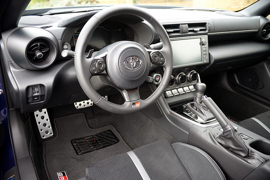 The reason Toyota fits a g-Force meter to the dashboard is to help you memorialize the heroic levels of side stick this little coupe is capable of generating. On our favorite 180-degree freeway off ramp, we were able to peg the meter with a cornering force of .7Gs. It might even have been a tad more, but when you've got the steering wheel cranked hard over, your hand tends to obscure the g Meter. We'd prefer it if g-readout were centered on the central 8-inch touchscreen rather than buried on the left side of the instrument binnacle.