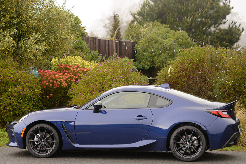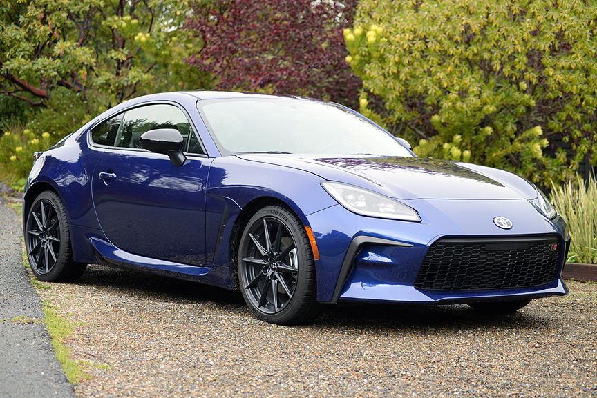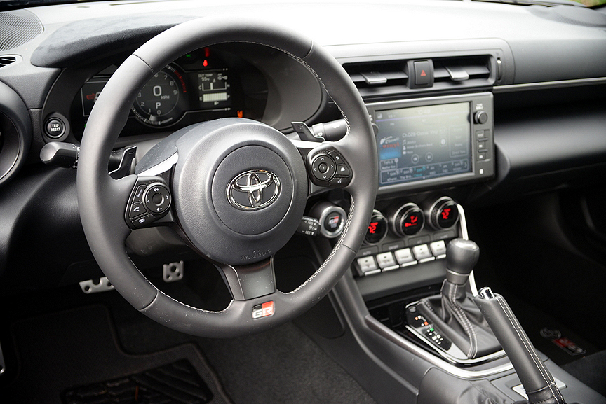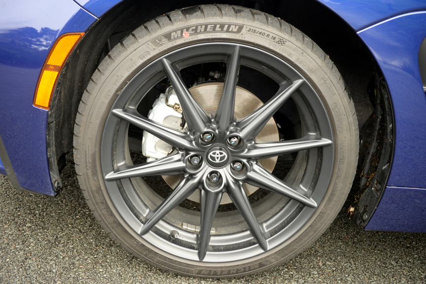 Ergonomically, there are some drawbacks to driving a virtual race car on the street. One is the jiggly ride which makes it difficult to control the fine-tuning volume and station buttons on the radio face plate. The tiny buttons themselves look like they came from a 1990 Radio Shack catalog. However, you can also access these functions via the spokes of the nifty small diameter steering wheel. Our Trueno Blue test GR86 came with a set of matte black alloy rims which carried extra cost "Black Lug Nuts and Wheel Locks" for $295. Ironically, the black lug nuts were all color tabbed by inspection marks in blue and yellow, which kind of negated the idea of paying extra for black nuts. If we were ordering a GR86 Premium, we would probably choose a set of polished alloy rims to add some extra bling to the car's rather somber blue hue.