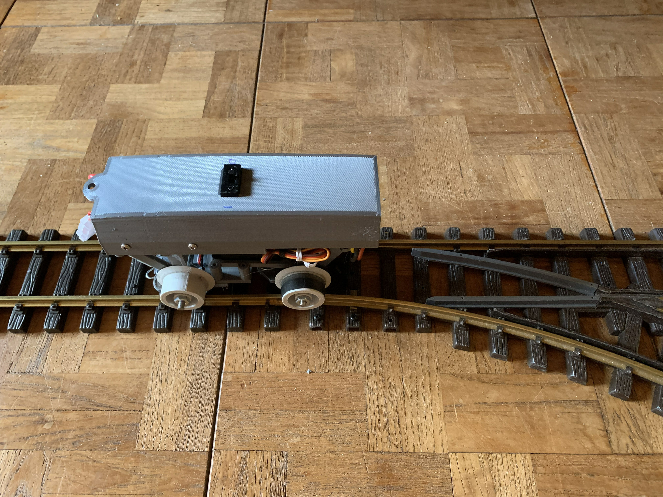This new invention, first shown at an April model train show in Denver, enables rail vehicles to switch themselves while running on passive tracks.