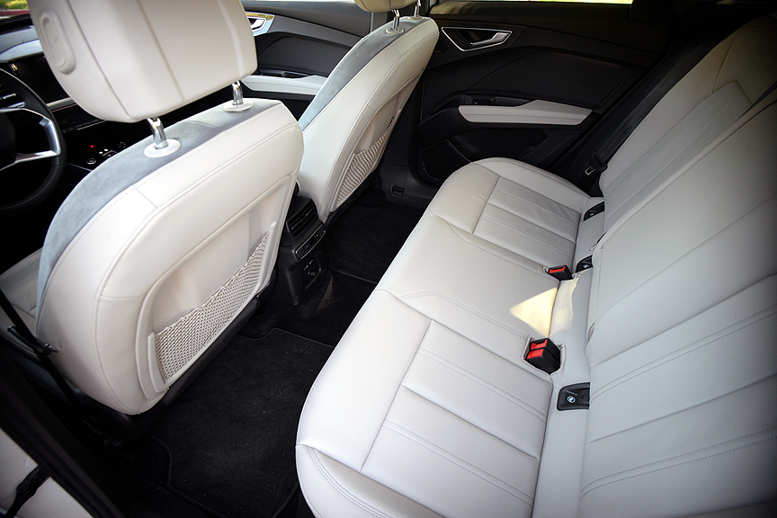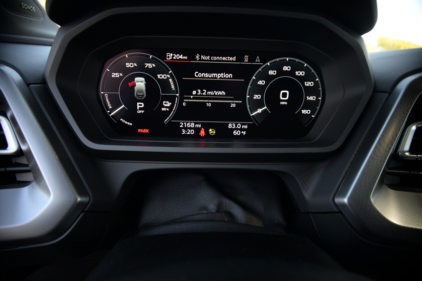 The only hint the driver gets that he's commanding a near 5,000-pound SUV and not a sports car is the head toss the tall (64 inch high) Q4 issues as it bobs and weaves like a heavyweight prize fighter. Brakes, however, are not up to the performance level of the suspension, with a spongy pedal yielding unpredictable engagement points. On the freeway, the e-tron is the ideal silent skimmer, with no wind noise, no motor intrusion, and no tire whine to sully an interior quieter than Thoreau's cabin in Concord.