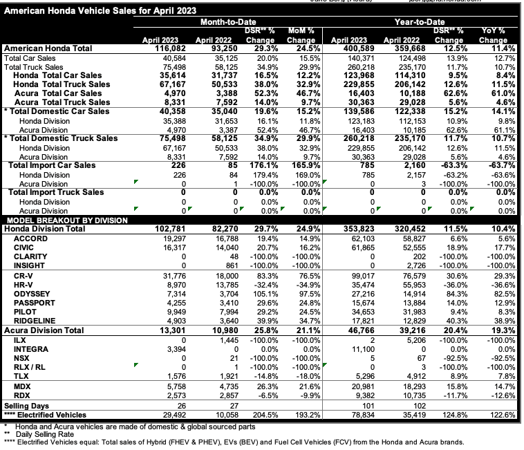- Honda tops 102,000 units in April, up nearly 25% for the month with strong sales across the lineup