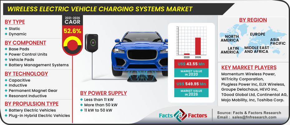 Facts and Factors published the latest report titled "Wireless Electric Vehicle Charging Market Size, Share, Growth Analysis Report By Application (Home Charging Unit and Commercial Charging Station), By Charging Method (Resonant Inductive Power Transfer (RIPT), Capacitive Wireless Power Transfer (CWPT), Inductive Power Transfer (IPT), and Magnetic Gear Wireless Power Transfer (MGWPT)), By Power Supply (More than 50 KW, 11 to 50 KW, and 3 to less than 11 KW), By Propulsion (Battery Electric Vehicle (BEV), Commercial Electric Vehicle, Plug-In Hybrid Electric Vehicle, and Crew Exploration Vehicle), and By Region - Global and Regional Industry Insights, Overview, Comprehensive Analysis, Trends, Statistical Research, Market Intelligence, Historical Data and Forecast 2022 – 2030" into their research database.