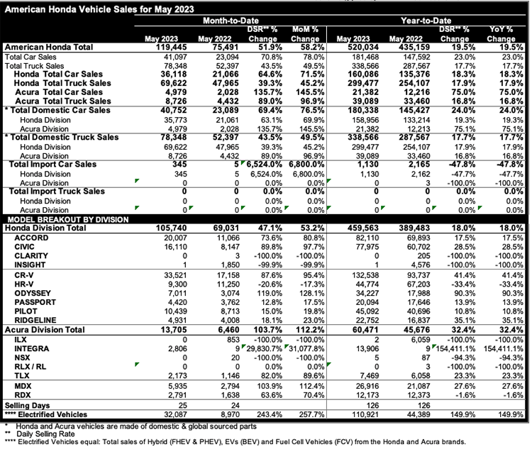 - Healthy supply helps Honda and Acura brands post double-digit growth by leveraging new products to top 119,000 units in May