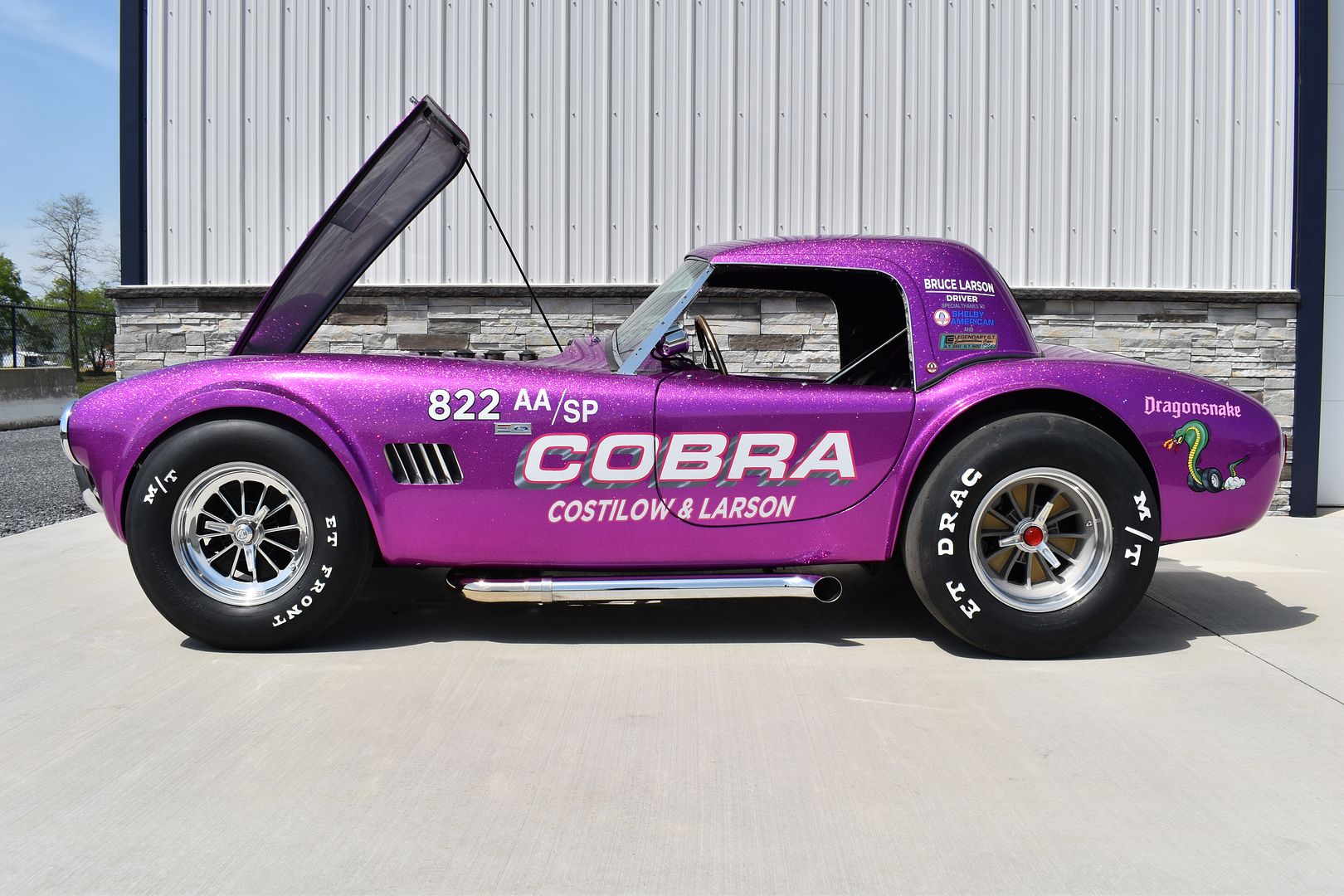 The first car in the series honors Larson’s 1963 Shelby 289 Cobra Dragonsnake, named the most successful drag-racing Cobra of all time. Per the Shelby American World Registry, CSX2093 was a street Cobra that became a Dragonsnake racecar. The transformation included new rear-fender flares, American Racing wheels, drag slicks, a chrome roll bar, Sun tachometer and chassis tweaks. Side curtains and a hardtop improved aerodynamics.