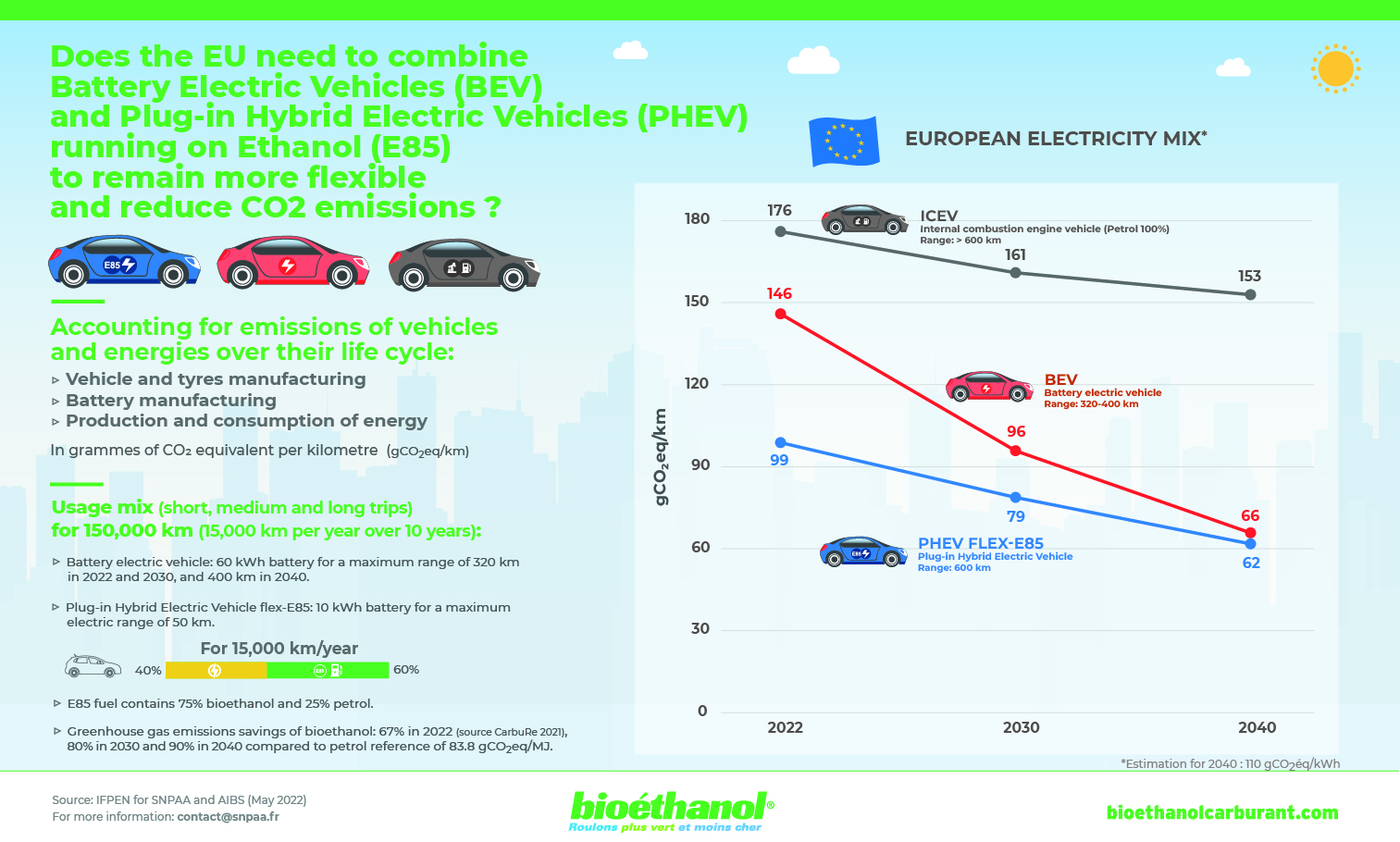 This comparison, applying to 2022 with projections for 2030 and 2040, shows that plug-in flex-fuel hybrids compatible with E85 operating 40% of the time as an electric vehicle are at least as climate-friendly as battery electric vehicles, with the French electric power mix which is already low-carbon, and even more with the average European mix, which has a higher carbon footprint.